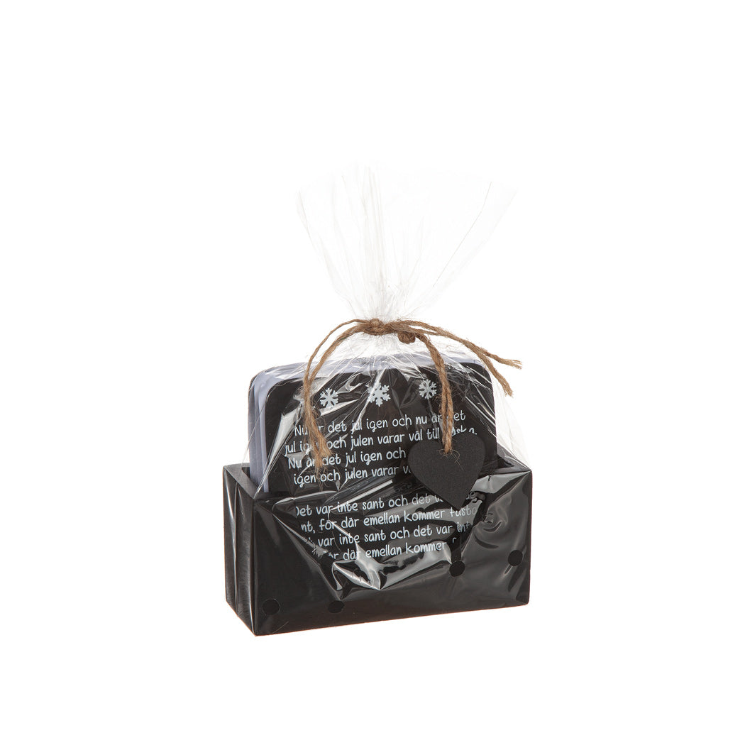 Skapa en härlig julstämning vid dukningen med vårt set om fyra glasunderlägg i trä. Motiven är hämtade från de klassiska julsångerna Nu är det jul igen och Hej tomtegubbar, vilket gör dem till en stämningsfull detalj på julbordet eller vid glöggfesten.