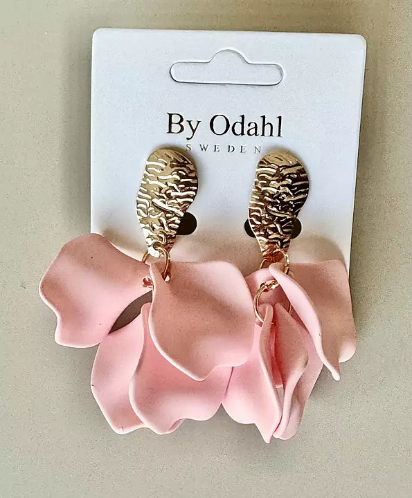 Fånga uppmärksamheten med dessa somriga örhängen från By Odahl. En elegant hamrad plåttopp möter ett mjukt, lövformat hänge i färgad plast – dekorerat med flera små pärlor som rör sig lätt när du går. Resultatet? Ett iögonfallande smycke som kombinerar struktur med lekfullhet.