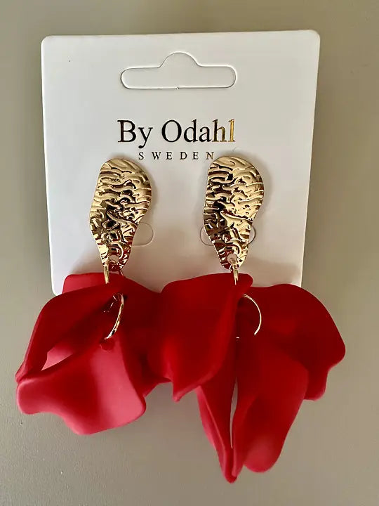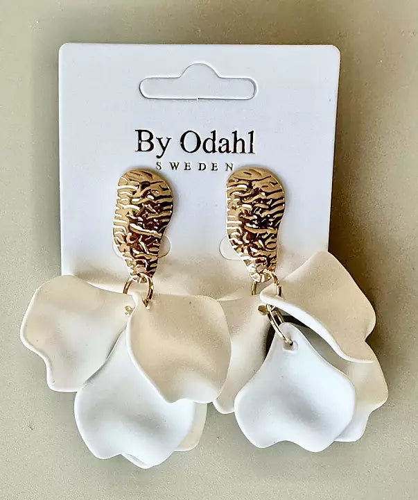 Fånga uppmärksamheten med dessa somriga örhängen från By Odahl. En elegant hamrad plåttopp möter ett mjukt, lövformat hänge i färgad plast – dekorerat med flera små pärlor som rör sig lätt när du går. Resultatet? Ett iögonfallande smycke som kombinerar struktur med lekfullhet.