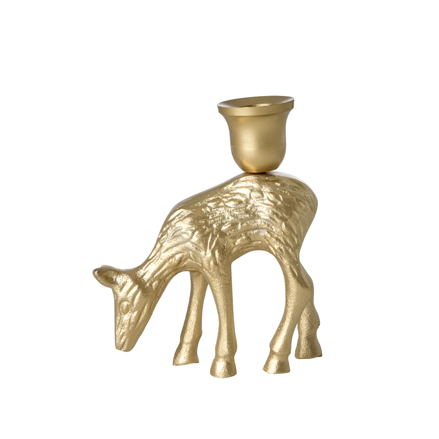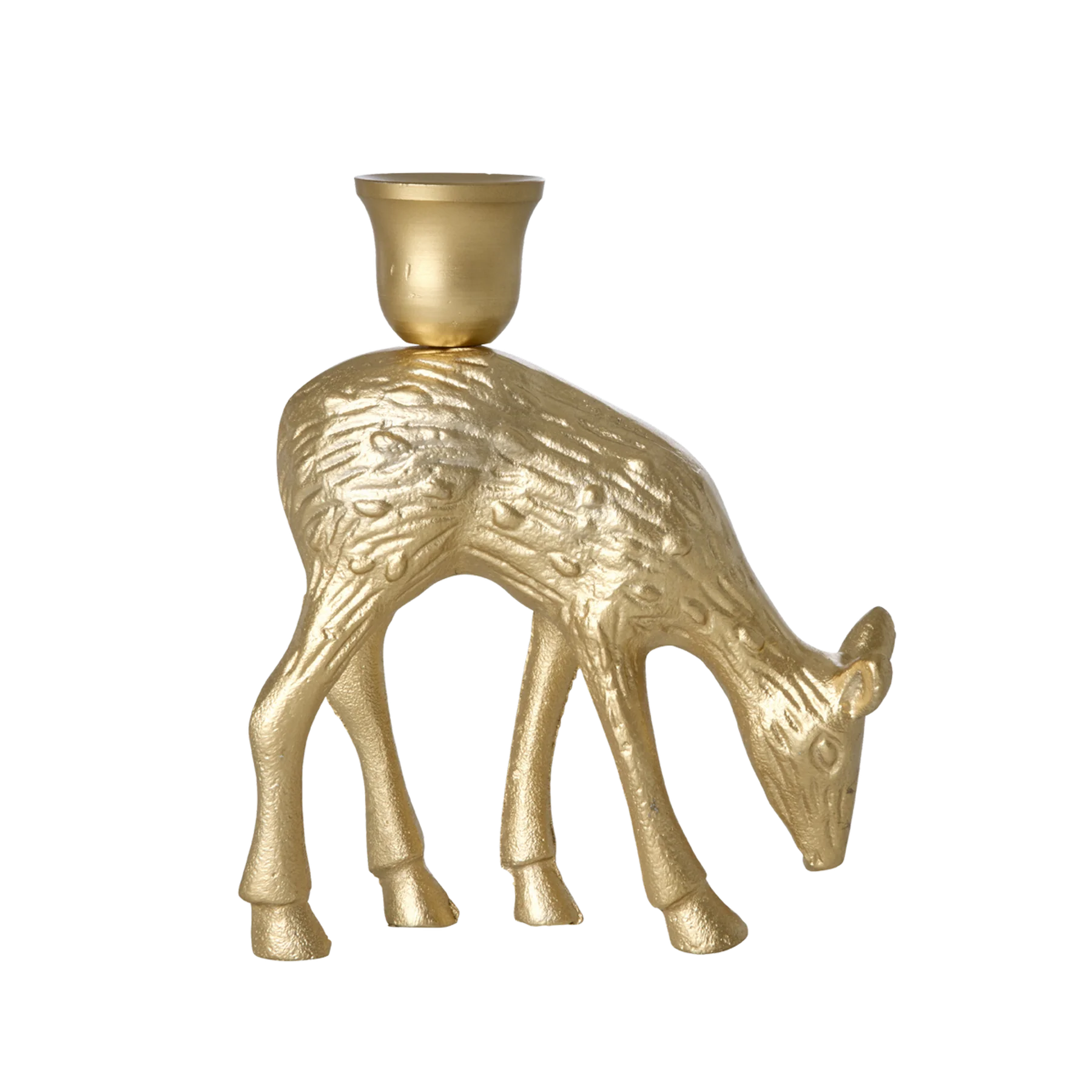 Skapa en magisk julstämning med vår vackra renljusstake i gyllene aluminium. Ljusstaken finns i två storlekar – liten (14 cm hög) och stor (16 cm hög) – och blir en charmig detalj oavsett var du placerar den. Den eleganta designen med renmotiv sprider både värme och julkänsla och gör den till en perfekt dekoration på bordet, i fönstret eller på hyllan.